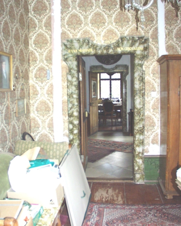 One can see to the right and the left of the doorframe 2 strips of the wallpaper are missing, having been removed to build in 2 steel carriers -6.5 cm broad- hinged with steel carrieres in floor and ceiling and so securing the castle´s second floor statically.
