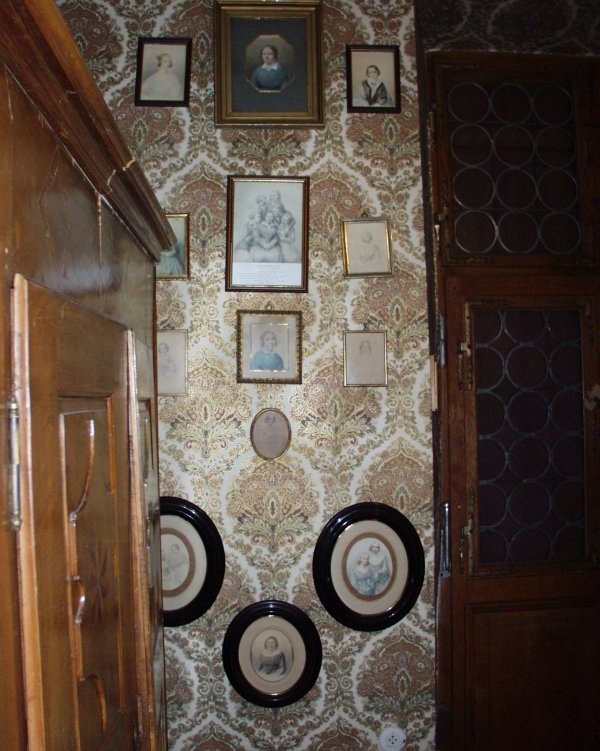 My parents found the wallpaper in a french wallpaper-book in 1965 and ordered it. After papering the walls we found it much too massive for this small room. The three armed chandelier had been damaged during restoration part I, one arm broke off.