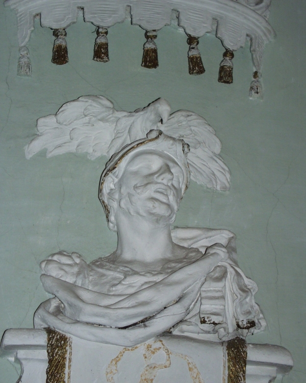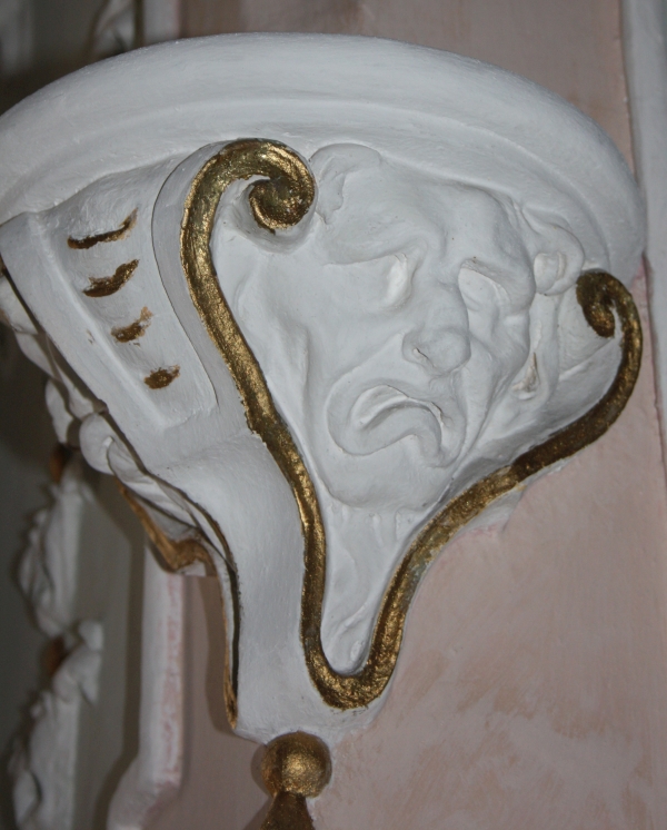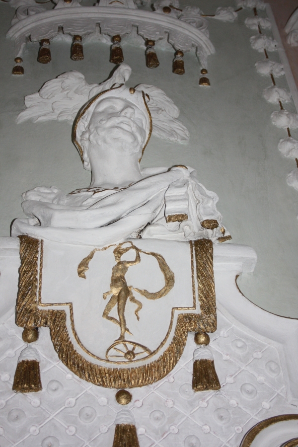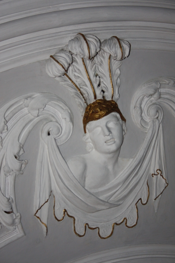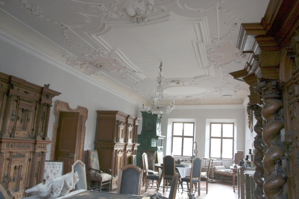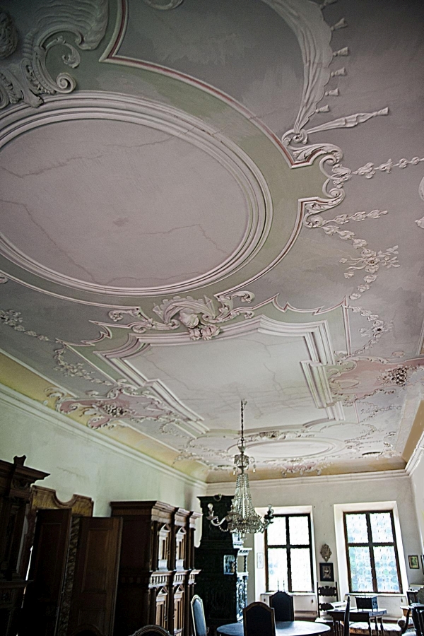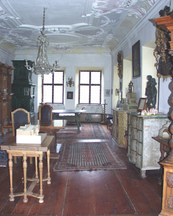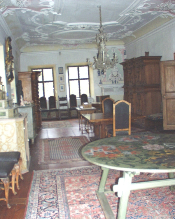 Endlich, im dritten BA zwischen 2015 und 2017 waren Gelder für die Schönheit da. Um den großen Saal restaurieren zu können, mußten alle Bilder und Totenschilde abgenommen und alle Möbel eingepackt werden. eingepackt Der große Saal ist nun auf die Farbigkeit der Zeit seiner Stuckierung zurückgeführt. auch das Gold leuchtet wieder so wie damals. Dies ist kein Blattgold, sondern Gold, das in Königswasser aufgelöst und aufgepinselt wurde. Nach Verdampfen des Lösungsmittel bleibt das reine Gold auf dem Untergrund.