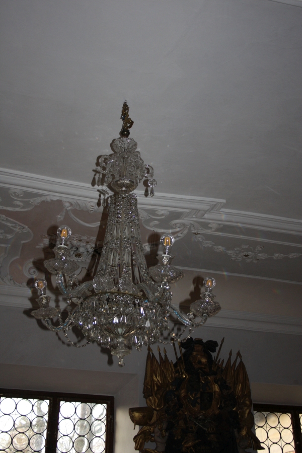 Der Lüster hängt wieder auf seiner originalen Höhe, so dass man nicht mehr fürchten muß, dass sich jemand den Kopf dran stößt.
