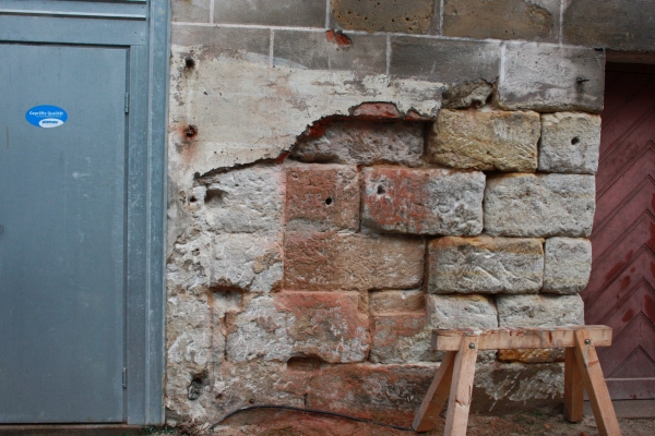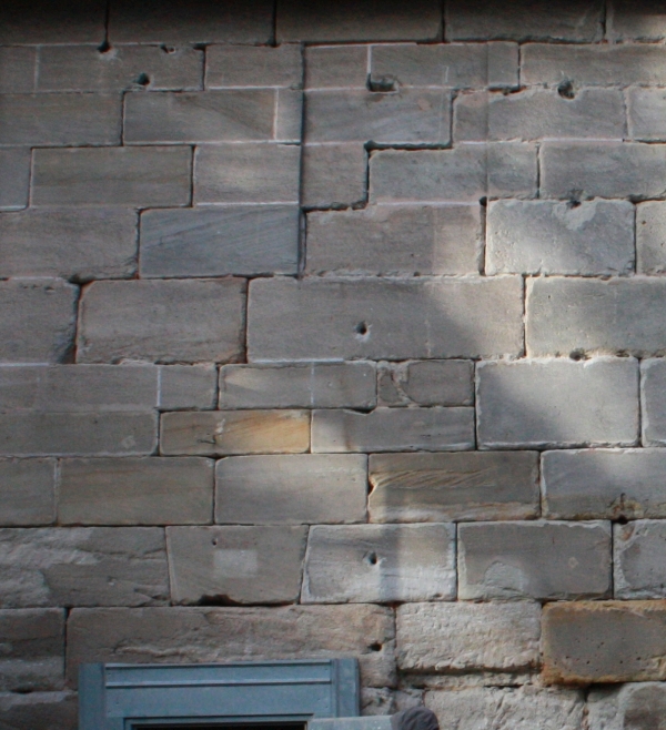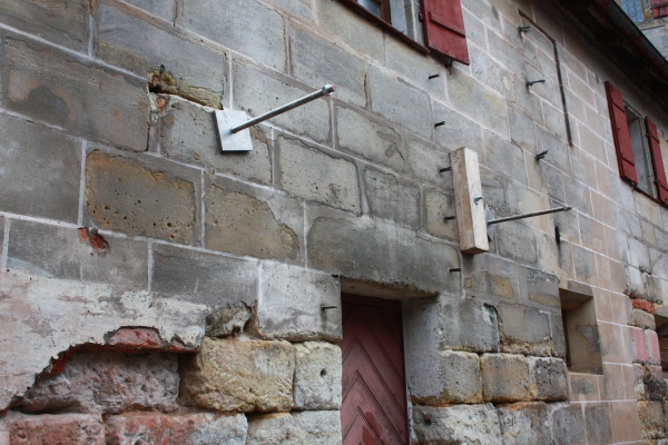 The former facade made from frame work got rebuilt out of sandstone stemming from the dwindling quarries around the castle. Therefore they were of lesser quality and partly much smaller than the rest.