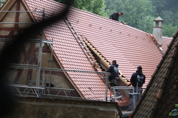 and because of the abuse of its former inhabitants the Verwaltershaus had huge statical problems. Its roof had been tiled in 1967, but the tiles came from a misfiered pottery and had split lengthwise to the most part. In 1999 my father tried to secure the Verwaltershaus statically, but it didnŽt come out as expected.