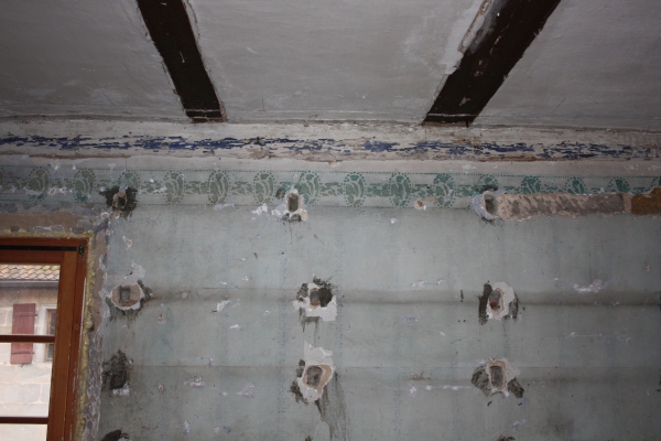 At the time being our restorers are uncovering the beams in the other ceilings. These have got a light yellow setting going over into the loam plastering and being accompanied by a black line. This setting weŽll restore and show again.