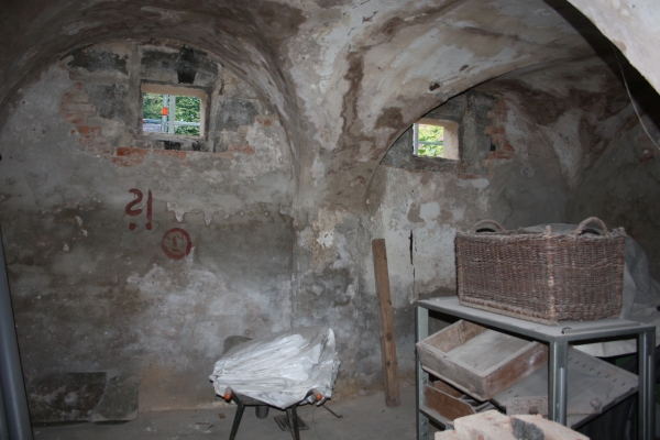 The heating system is a so called hypocaust heating system, a primary walling made of hollow tiles with eco lines filled with warm water. The warm water stems from our pellet heating system in the Palas and comes subterraneously into the Verwaltershaus.