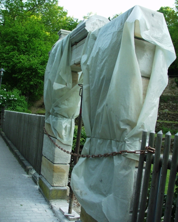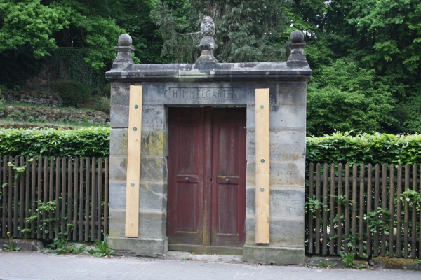 1997 war das Himmelgartentor beim Wiederherstellen des Himmelgarten umgestoßen und sehr zerstört worden. |