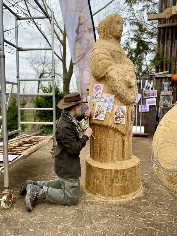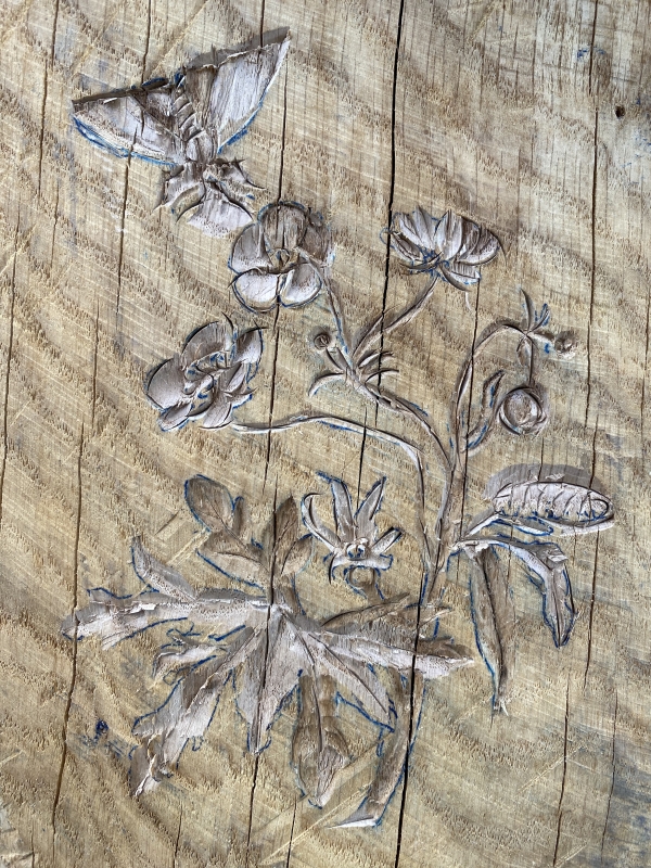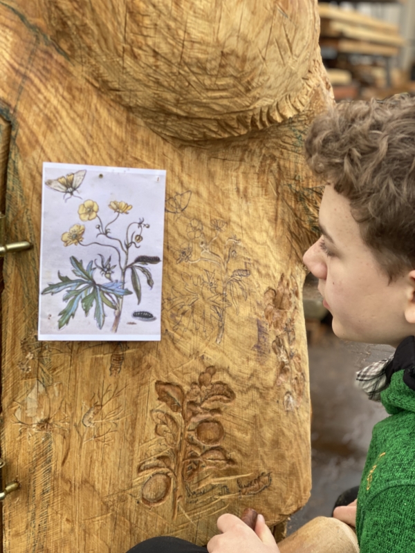 Die Blumen und Tiere ihrer Zeichnungen werden auf dem Eichenstamm fixiert, |
